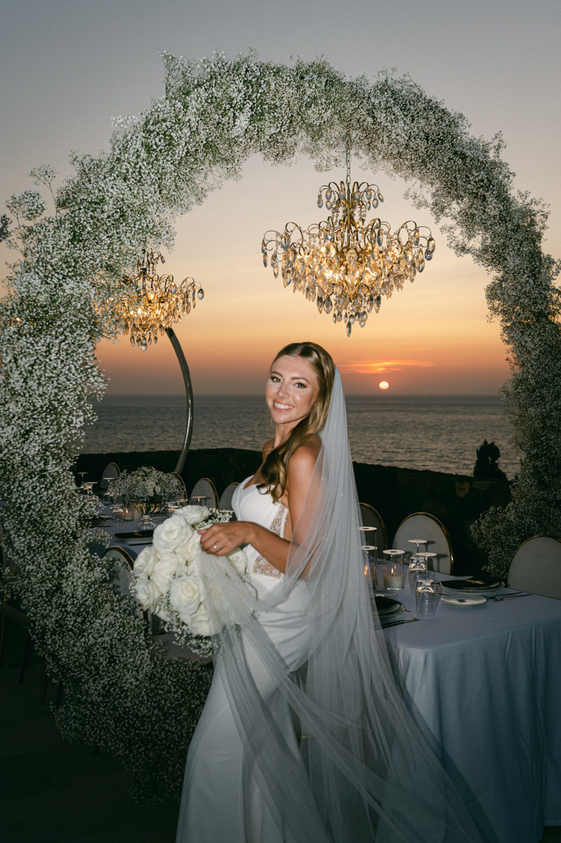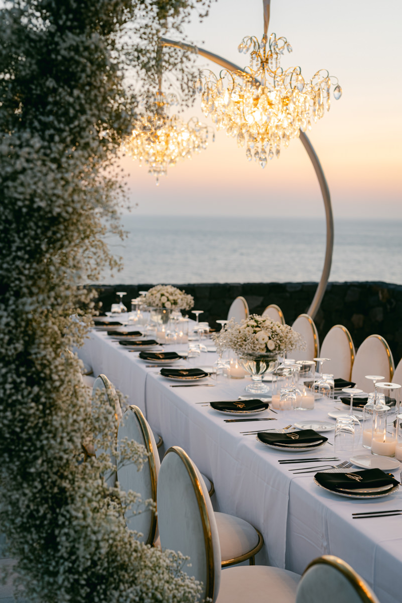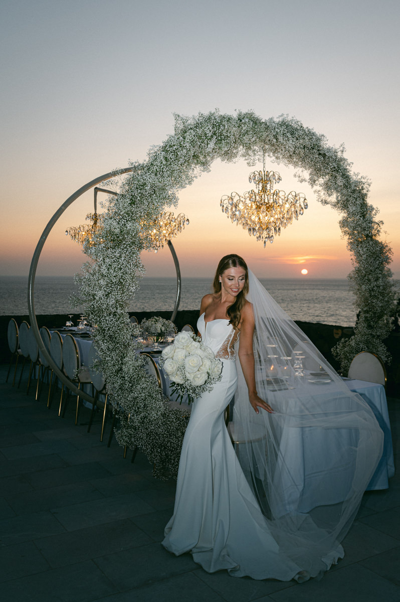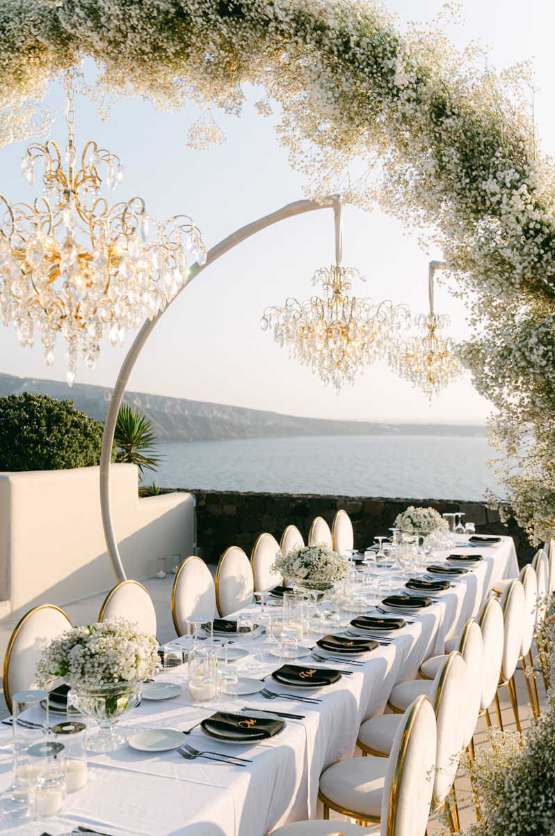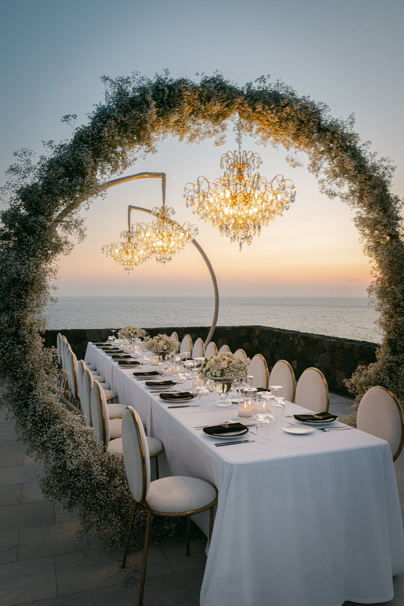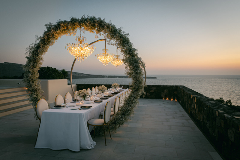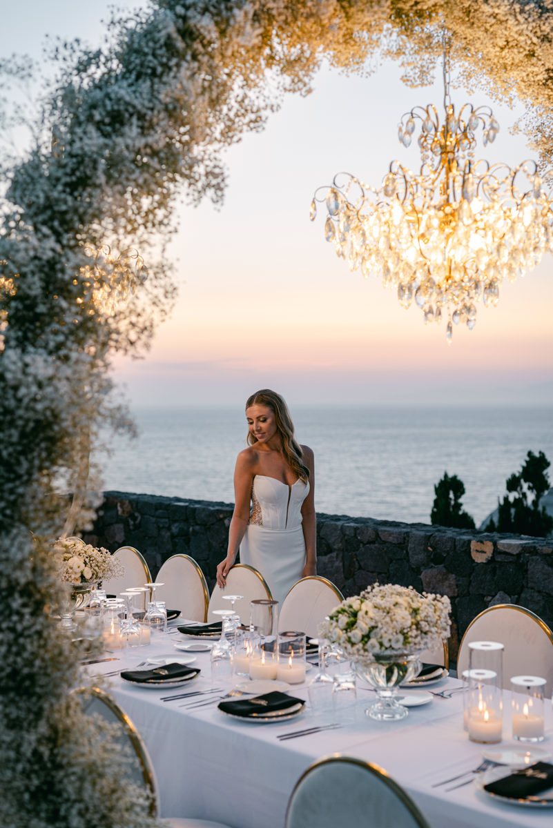 The majestic Cycladic islands where the ancient volcanic land of Santorini embraces the infinite vistas of the Aegean Sea. Suspended above this beauty is the Canaves Epitome. A unique space where luxury and serenity come together. An elegant terrace made for the perfect setting for the celebration of Sophie and Alex with a beautifully curated weddingscape of soft colours and enchanting light.